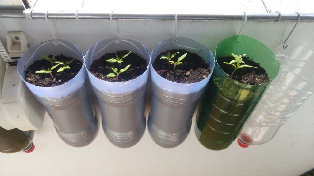 El año pasado saqué alrededor de 2kg o un poco mas incluso de tomates (según variedad) por botella de 2 Litros que tienen una profundidad de tierra de unos 27 cm. Drenan por el tapón previamente agujereado. Ideal para interior y exterior, terrazas sombrías o soleadas según plantas.
